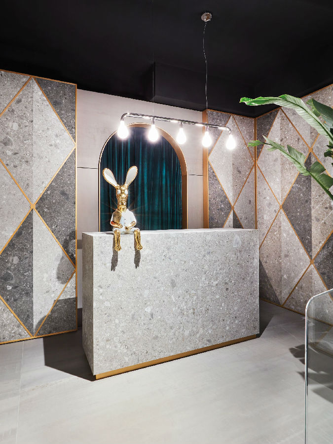 主宰空间是粉状调色板和柔和的几何形状,勾勒出天鹅绒般的材质世界。 “一切都是用陶瓷制成的,从柜台到桌子,地板,接待处和墙板”,Matteo说。环境一直用马拉齐大集合2018年,其中新增超尺寸160x320cm和162x324cm到120x120cm和120x240cm砖,两种厚度从6至12mm和新面貌的最珍贵的大理石,水泥和金属风格设计。